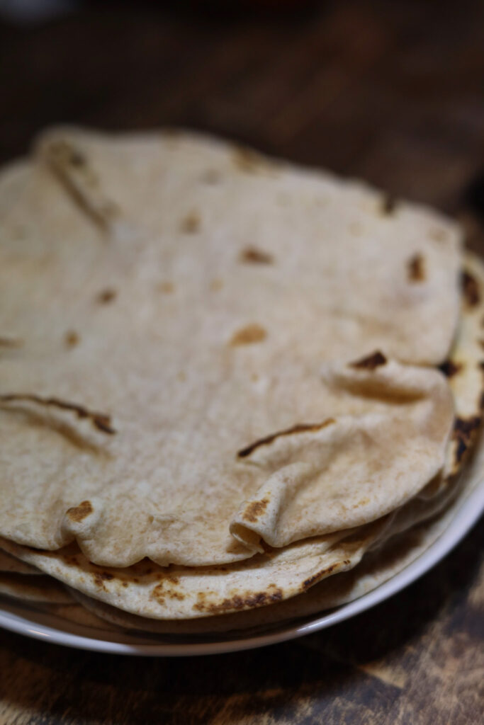 In this recipe I use 2 cups of all-purpose flour and one cup of whole wheat flour. I have done all whole wheat many times and it works great! You might not see as many large bubbles in your tortilla when using whole wheat, but don’t worry, it’s still delicious. If you are looking for a very airy, bubbly, tortilla I would recommend using all 3 cups of all-purpose flour.