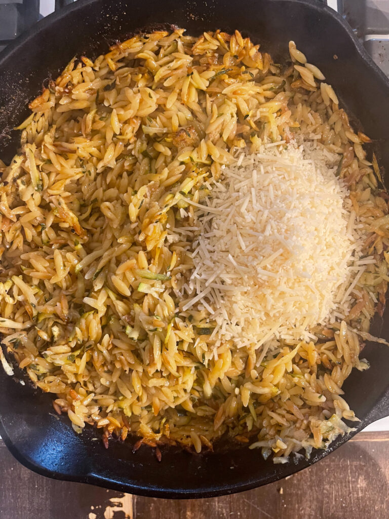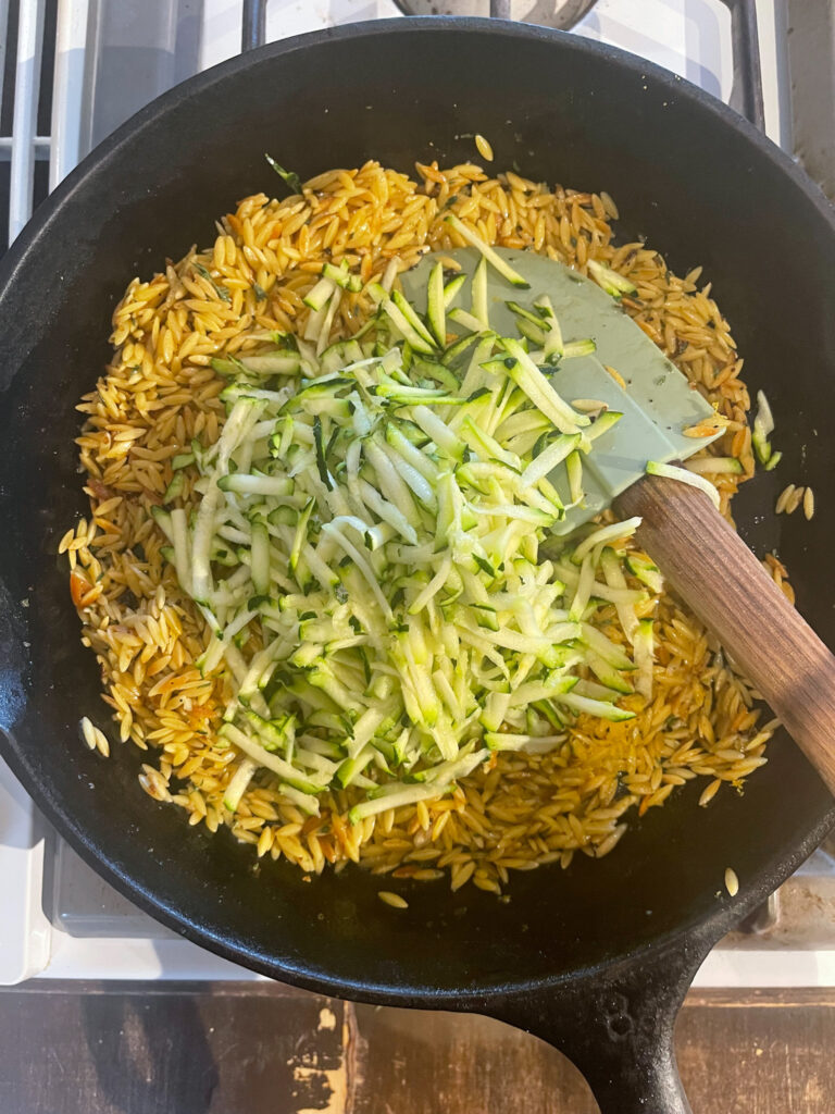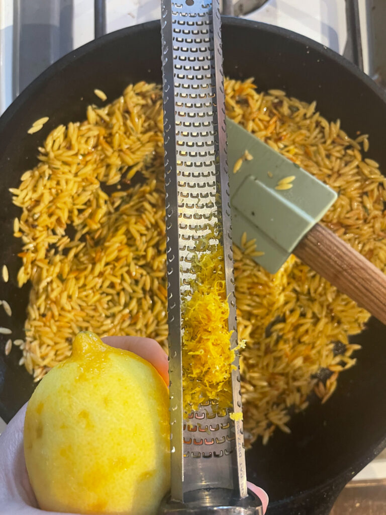 - Take your lemon, and zest the whole thing into the pan with the browned orzo.