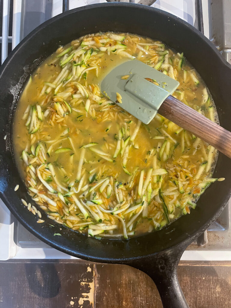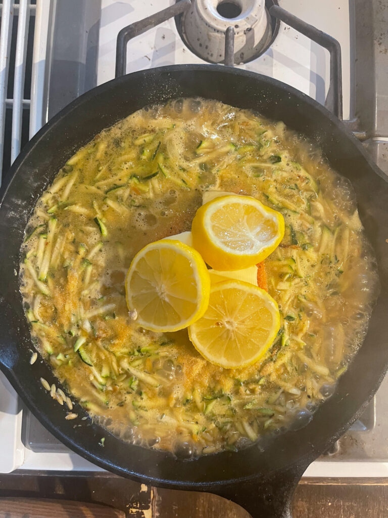 - Add in the shredded zucchini with the salt and lemon pepper. Add in the broth.
