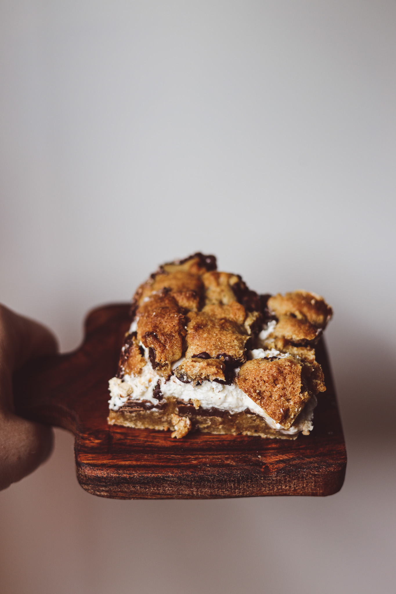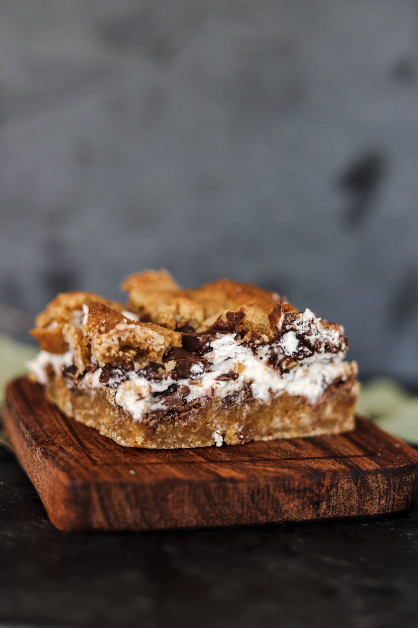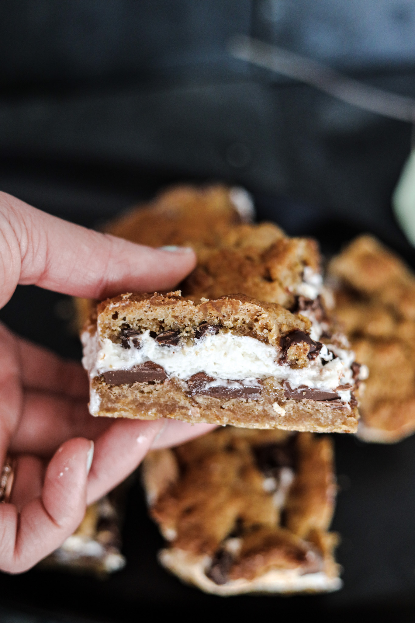 Growing up I always loved eating s’mores. There’s something comforting about s’mores and the smell of the bonfire after a fun long summer day. What I always hated was how sticky your fingers get when eating s’mores. It’s so inconvenient. While that never stopped me from eating them, I like to switch it up and make these cookie bars for the late spring and summer bonfire evenings too.